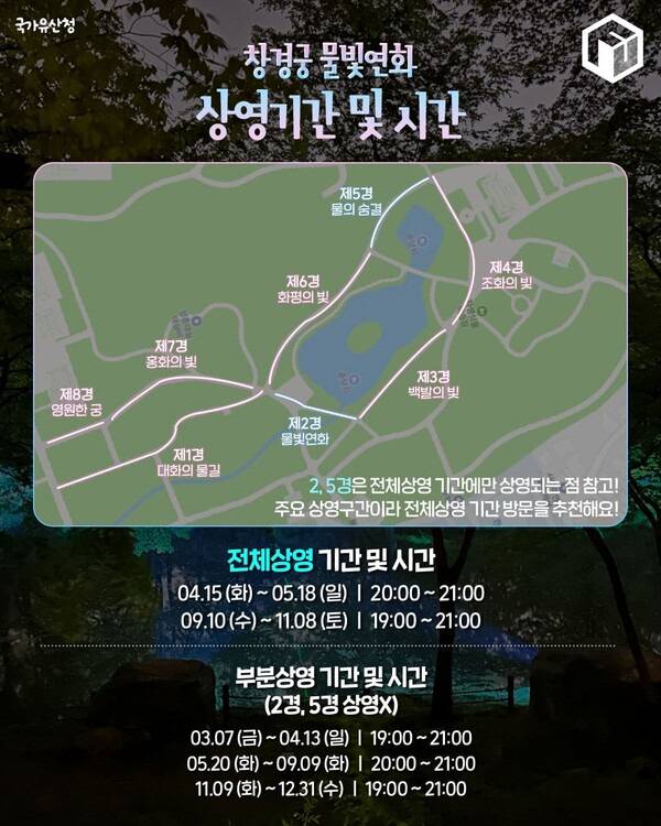 전체상영은 1경부터 8경까지 모든 야간조명과 미디어아트 작품 상영을 볼 수 있는 기간입니다. 상반기 2025 창경궁 물빛연화 전체상영 일정은 4월 15일 화요일부터 5월 18일 일요일까지이며, 하반기는 9월 10일 수요일부터 11월 8일 토요일까지입니다.