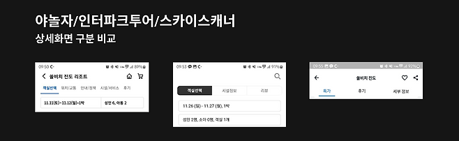 같은 숙소에 대해 야놀자, 인터파크투어, 스카이스캐너도 구성을 조금씩 다르게 가져가는 것을 알 수 있어요.