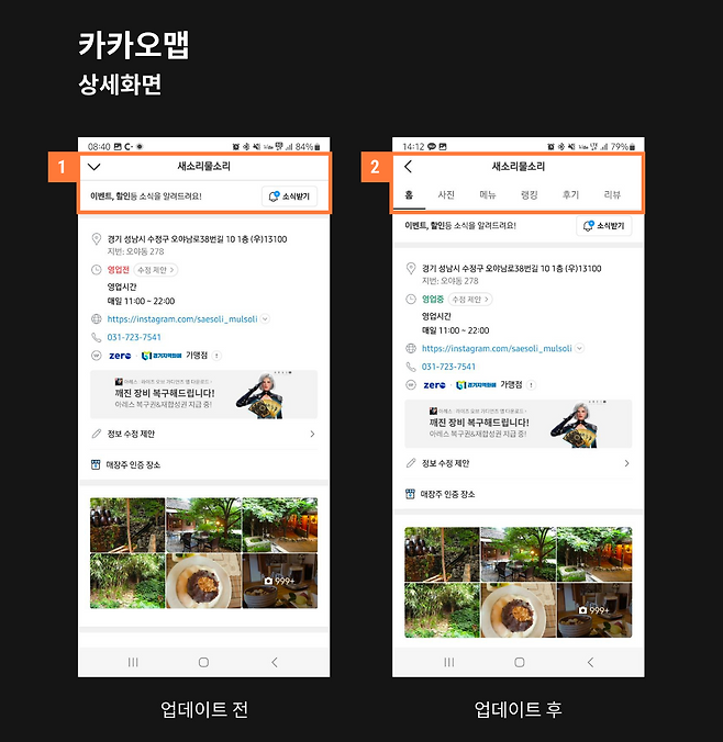 (2) 이런 불편을 카카오맵은 탭을 적용하는 것으로 해결했는데요. 선택 시 해당 정보만 모아볼 수 있는 역할을 하고 있어요. 홈 / 사진 / 메뉴 / 랭킹 / 후기 / 리뷰 등 총 여섯 가지로 적용되어 있는데 전, 후를 비교하면 후의 화면이 어떤 정보가 담겨있는지 더 빠르게 확인할 수 있는 모습입니다. 예를 들어 사용자가 장소의 후기를 먼저 보고 싶다면 상세화면으로 들어와 ‘후기’를 선택해 바로 확인할 수 있으며, 메뉴를 바로 보고 싶다면 같은 방법으로 ‘메뉴’를 선택할 수 있어요. 기존에는 스크롤을 내리며 어디에 메뉴가 있고, 어디에 후기가 있는지 스스로 찾아야 했기에 더 편리하게 느껴지는 변화입니다.