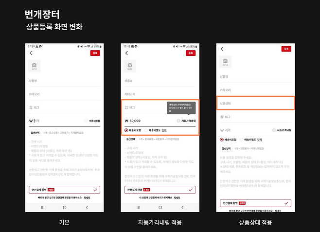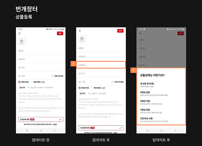 기존 상품등록 화면의 카테고리 선택 및 태그 입력 필드 사이에 (1) ‘상품상태’ 기능이 적용되었는데요. 중고거래에서 사람들이 중요하게 생각하는 것 중 하나가 가격인데요. 가격은 사용 상태에 따라 판매자가 책정하게 되고, 마찬가지로 상태에 따라 구매하려는 사람들이 판단하는 기준으로 활용됩니다. 보통은 상품의 사진 또는 상품 설명에서 이런 상태를 확인하게 되는데요. 사진만 보고 정확히 판단이 어렵거나, 설명에 상태에 대해 충분히 설명하지 않은 경우 구매가 꺼려질 수 있어요. 당연히 입력되어야할 정보라고 생각할 있지만, 상품등록 시 빼놓을 가능성도 있고요.
