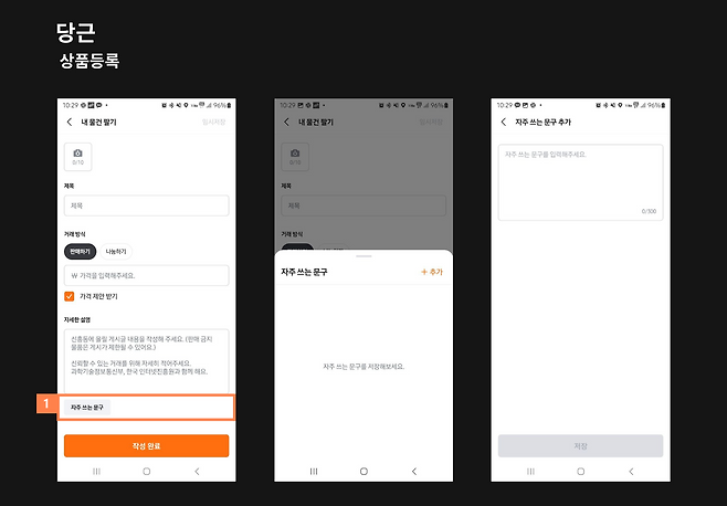 당근은 최초 작성화면을 최대한 간단히 구성하는 것을 목표로 하고 있어요. 카테고리는 제목을 입력하는 순간 키워드에 맞게 추천(카시트 입력 시 유아동이 추천)되며 그에 따른 세부내용(사용할 나이 등)을 선택할 수 있어요. 상품에 대한 설명도 직접 쓰는 공간 하나를 유지하고 있는데, 편의를 위해 (1) 자주 쓰는 문구 기능을 제공해요. 상품의 상태 등을 미리 입력해 두면 자주 쓰는 문구 리스트에서 선택해 바로 입력할 수 있는 구성입니다.