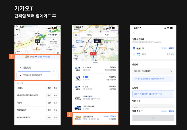 편의점 택배 서비스는 카카오T 메인화면 ‘퀵/배송’ 퀵메뉴 내에서 이용할 수 있는 서비스인데요. 화면 진입 후 (1) 도착지를 선택하는 플로우로 구성되어 있습니다. 이때 사용자가 입력하는 도착지는 편의점 점포나 건물명 등 여러 형식으로 선택할 수 있는데요. 편의점 택배 서비스가 퀵서비스와 함께 제공되는 형식이기 때문에 별도 구분은 해두지 않은 것으로 보여요. 출발지는 입력된 상태에서 도착지만 사용자가 바로 입력할 수 있도록 구성해 출발지를 별도로 입력해야 하는 불편함을 줄인 점도 눈에 띕니다.