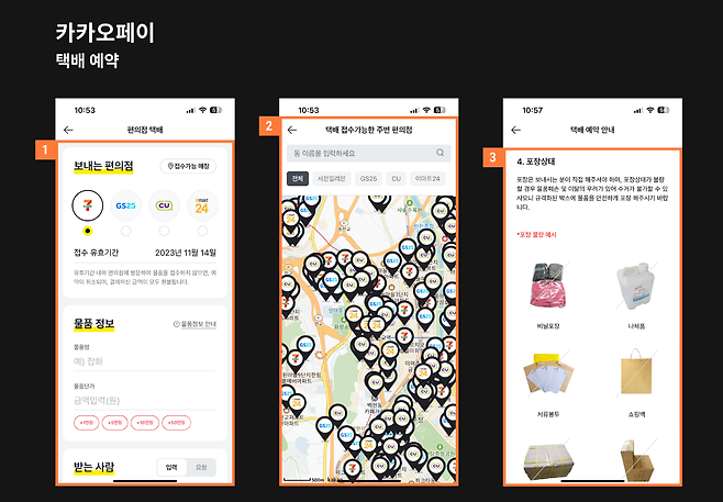 (2) 다음은 편의점 확인 화면인데요. 화면 내 탭을 활용해 편의점별 위치를 확인할 수 있도록 구성되어 있어요. 한 가지 눈에 띄는 점은 화면 상단 타이틀인데요. 바로 ‘택배 접수 가능한 주변 편의점’이라는 문구로 해당 화면이 어떤 기능인지를 명확하게 보여주고 있는 점이에요. 카카오T의 경우 접수 화면에선 접수 가능한 편의점이라고 문구가 노출되어 있었지만 지도 화면 내에선 별도 문구가 없어 편의점 선택을 어떻게 하는지 헷갈렸던 경험이 있었는데요. 이런 경우 카카오페이의 사례처럼 상단 타이틀을 통해 현재 화면이 어떤 기능인지에 대해 알려주는 방식을 활용해 볼 수도 있을 것 같아요. (3) 마지막으로 택배 예약 안내 영역에선 텍스트보다 이미지가 더 전달력 있는 부분은 이미지를 활용해 보여주고 있는 점도 인상적이었어요.