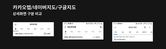 1-1. 카카오맵, 네이버지도, 구글지도의 상세화면 구분