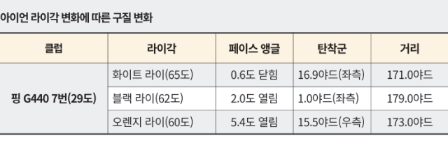 화이트(65도)와 오렌지(60도) 아이언의 라이각은 5도 차. 어떤 이는 “고작 5도”라고 할 수도 있지만 그 5도로 인해 볼의 방향은 완전히 반대가 됐다. 볼이 떨어진 좌우 거리 평균 차이도 32.4야드나 벌어졌다.