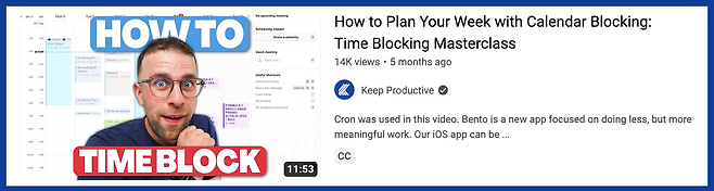 이 유튜브 영상을 보면 일주일 일정을 미리 계획하는 방법으로 calendar block을 소개하고 있어. 캘박과 비슷하면서도 다른 calendar block의 뉘앙스를 잘 보여주는 콘텐츠라고 할 수 있지.
