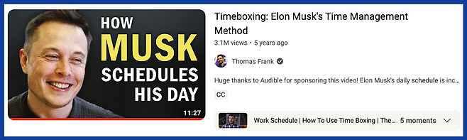Calendar(time) blocking과 time boxing은 비슷하지만 약간 달라. Calendar blocking이 어떤 일을 꾸준히 하기 위해 일정한 시간대를 미리 예약해두는 것이라면, Time boxing은 그 일을 하는 데 필요한 실질적인 시간을 계산해서 딱 그 시간 안에 일을 마칠 수 있도록 하는 거야. 그날 끝내야 할 작업이 무엇인지에 따라 하루를 짧게는 15분 단위로 조각조각 쪼개서 효율적으로 할일을 마칠 수 있도록 하는 거지. 테슬라와 스페이스X의 CEO인 일론 머스크가 사용하는 방법이라고도 알려져 있어!