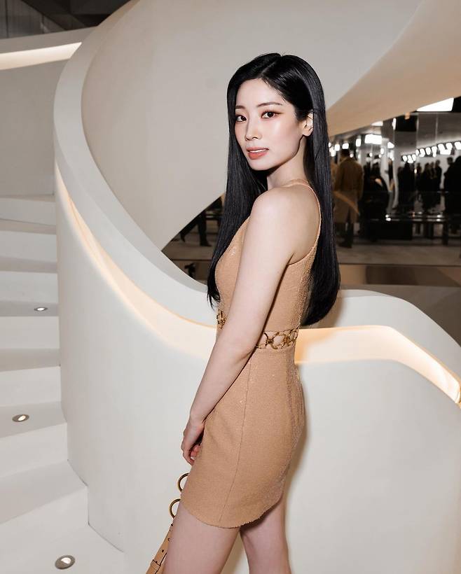 공개된 사진 속 다현은 누드톤의 미니 원피스룩으로 눈부신 각선미를 뽐냈다.