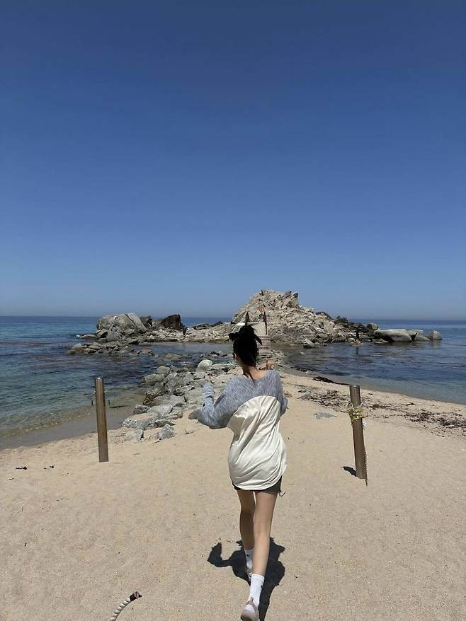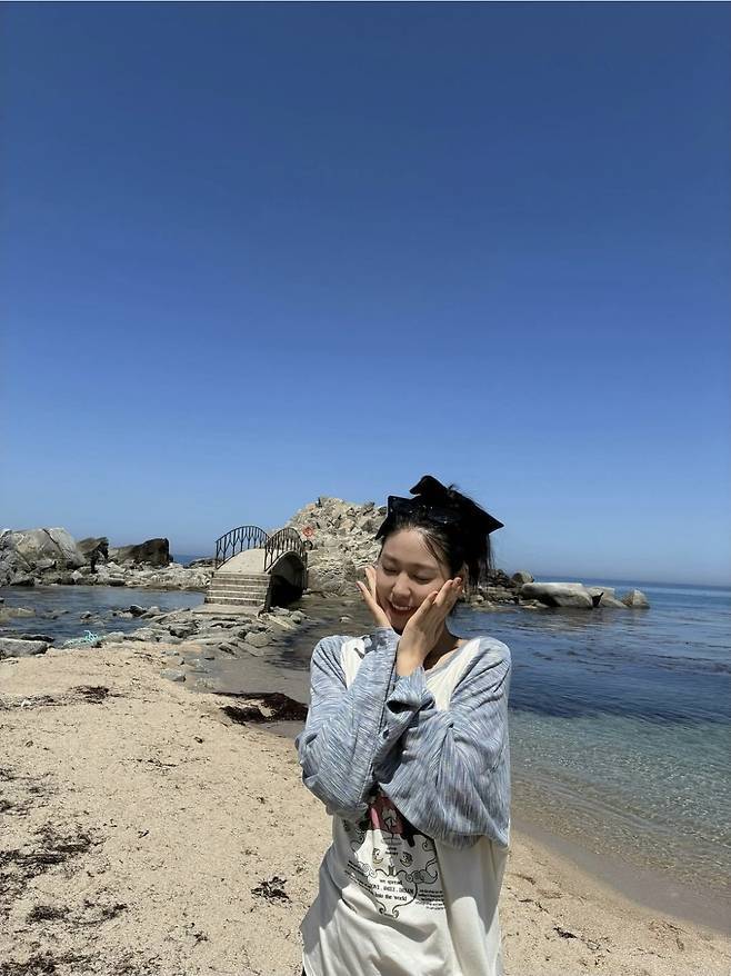 설현은 푸른 하늘과 바다가 어우러진 해변에서 내추럴한 휴가 패션을 뽐냈습니다.