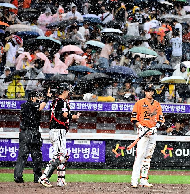 계속된 1사 2루다. 다음 타자 채은성의 타석이다. 초구에 방망이가 헛돈다. 여기서 구심이 타임을 부른다. 그러더니 선수들을 모두 불러들인다. 경기 중단 선언이다. 이때 시간이 오후 6시 43분이다.