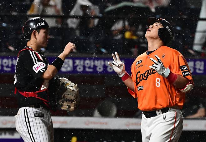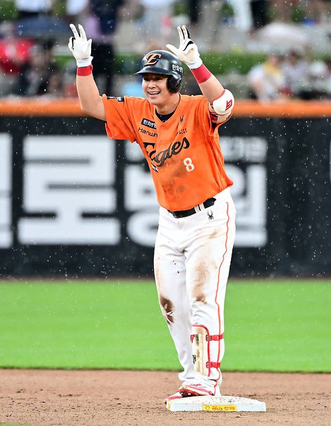 1사 후. 빗줄기가 갑자기 굵어진다. 그러거나 말거나. 노시환의 배트에서 불꽃이 튀긴다. 맹렬한 타구가 왼쪽 파울 라인을 타고 흐른다. 2루타다.