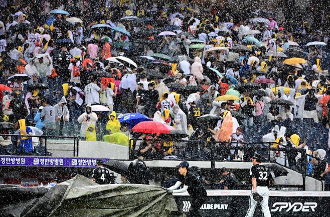 중단 결정은 당연하다. 앞이 안 보일 정도로 폭우가 쏟아졌다. 이 정도면 정상적인 진행이 불가능하다. 선수들 안전과 그라운드 보호가 필요하다. 물론 관중들도 마찬가지다.