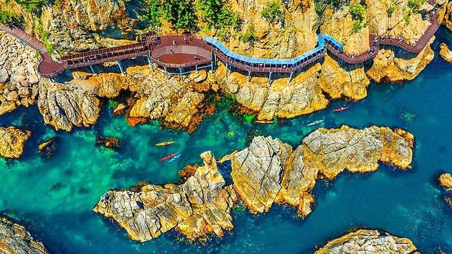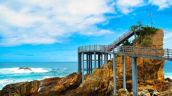 강원도 삼척시 근덕면 초곡길을 따라 펼쳐지는 ‘초곡 용굴 촛대바위길’은 총 660m의 탐방로로, 그중 512m가 바다와 맞닿은 데크길이다.