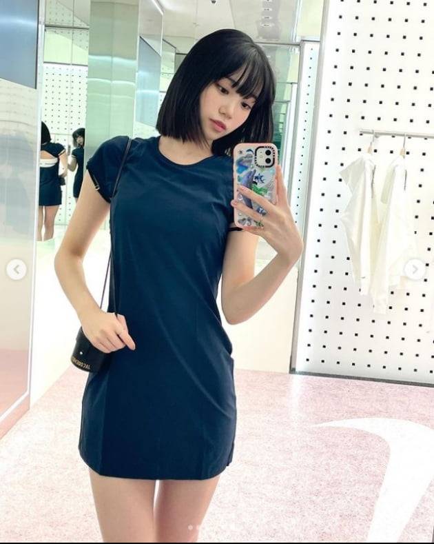 공개된 사진 속 김채원은 흰색과 남색 의상을 입은 채 거울 셀카를 찍고 있다.