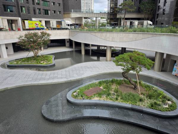 단지 입구를 지나 지하 1층으로 이어지는 커뮤니티 공간인 ‘써밋 라운지’에 들어서니 중앙부에 조성된 ‘선큰 정원’이 한눈에 들어왔다. 곡선형 정원 바닥을 따라 물길이 흐르고, 소나무와 배롱나무를 각각 식재한 작은 섬 형태의 조경 공간이 정원 가장자리를 따라 이어졌다. 최근 입주를 마친 윤 모씨(54)는 “단지 밖으로는 공원이 펼쳐지고, 내부에는 정원이 조성돼 있어 곳곳에서 여유를 즐길 수 있다”며 만족감을 드러냈다.