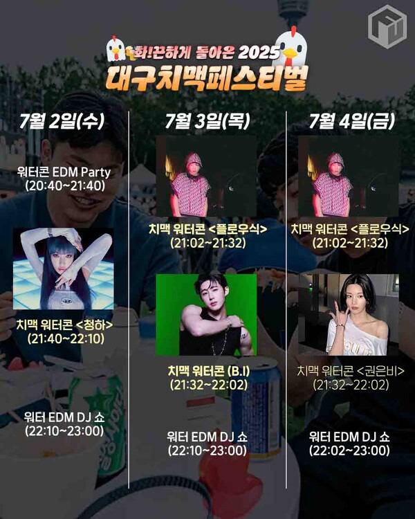 대구 치맥페스티벌 2025 워터 EDM DJ 쇼와 워터콘 EDM 파티는 매일 밤 10시부터 클라이맥스를 장식합니다. 주요 라인업에는 청하, B.I, 권은비, YB, K2 김성면, 딘딘, 닛몰캐쉬 & 일오팔 등 눈에 띄는 아티스트들이 등장할 대구 치맥페스티벌 2025입니다.