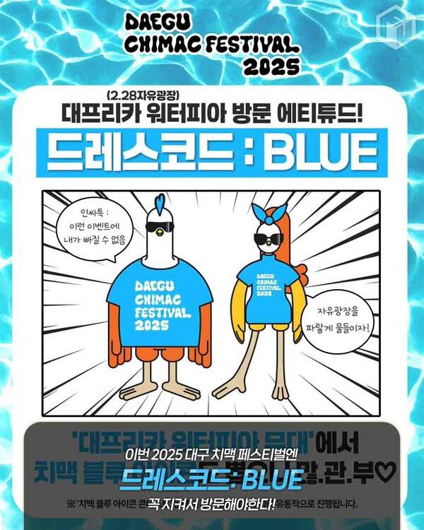 올해 대구 치맥페스티벌 2025의 특이사항 중 하나는 바로 ‘치맥 블루존’ 드레스코드 이벤트인데요. 2.28 자유광장에서 열리는 치맥 워터피아 존에서는 ‘블루’ 색상의 의상이나 아이템 착용이 필수입니다.