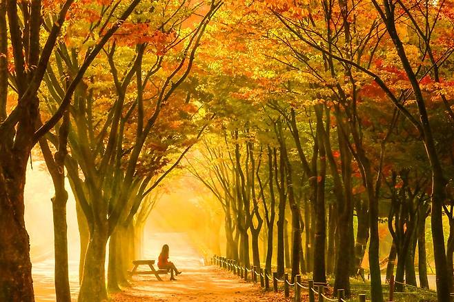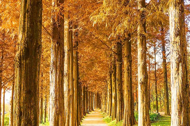 일반적인 단풍나무와는 달리 메타세쿼이아는 키가 크고 하늘로 곧게 뻗은 나무줄기를 따라 붉고 주황빛으로 물들어, 걸을 때마다 고즈넉한 가을 터널 속을 걷는 듯한 느낌을 줍니다.