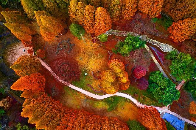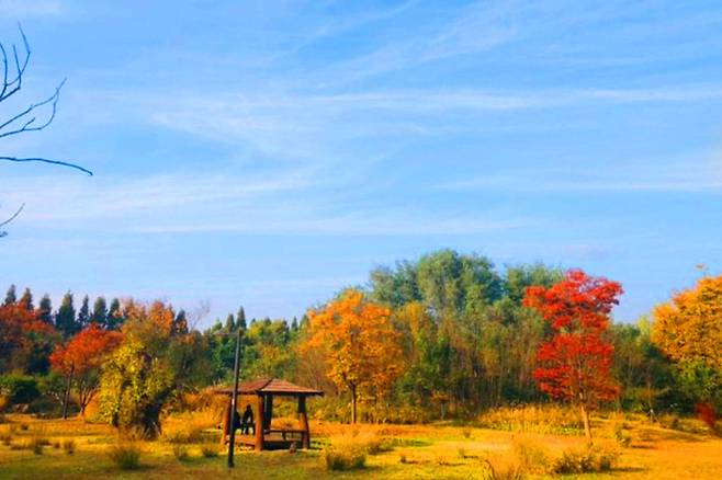 황금빛으로 물든 메타세쿼이아와 붉게 물든 단풍나무들, 그리고 넓게 펼쳐진 억새밭까지 한가득 가을의 색채가 담겨 있는 곳입니다.
