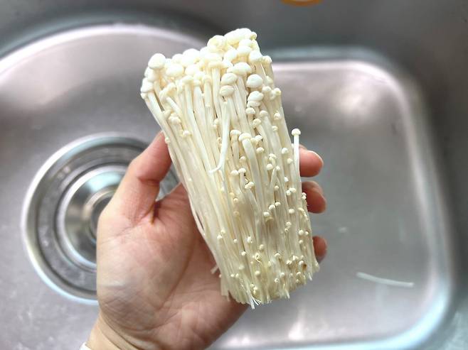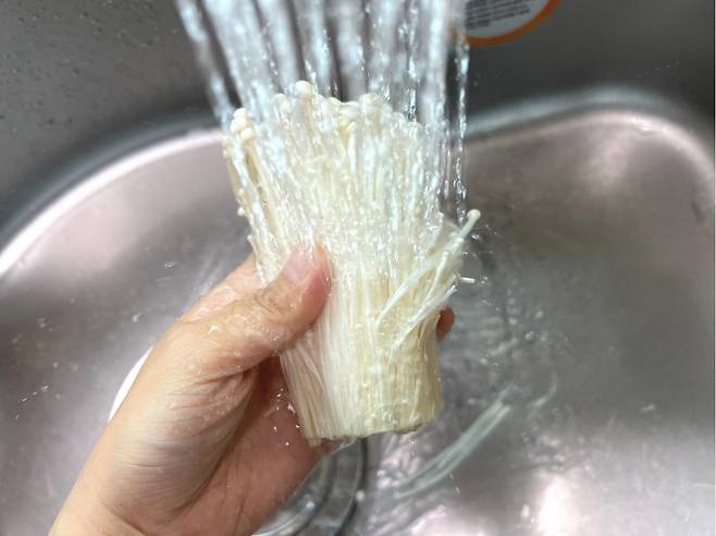 팽이버섯을 손질한 도마, 칼은 깨끗하게 씻은 후 다른 음식을 조리하셔야 합니다. 또 팽이버섯 조리 후엔 반드시 손을 깨끗하게 씻어 주세요