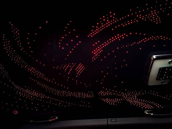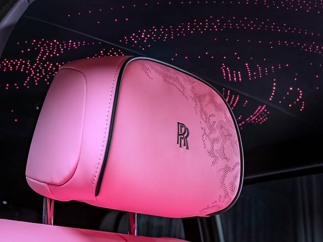 테크니컬 카본 파이버로 마감된 전면 페시아와 뒷좌석 워터폴 섹션에는 스테인리스 스틸로 세공한 실큰 스피릿 문양을 적용했으며, 부드러운 블러싱 핑크 색상 조명 아래 추상적으로 구현된 실큰 스피릿 문양과 흰색 '유성'이 어우러진 비스포크 스타라이트 헤드라이너가 환상적인 분위기를 자아낸다.