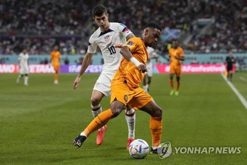 Jurrien Timber of the Netherlands, front, fights for the ball against Christian Pulisic of the United States during the World Cup round of 16 soccer match between the Netherlands and the United States, at the Khalifa International Stadium in Doha, Qatar, Saturday, Dec. 3, 2022. (AP Photo/Natacha Pisarenko)