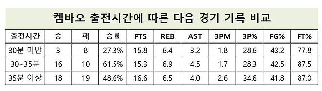 분명한 건 켐바오는 더 오랜 시간을 코트에 서 있어야 다음 경기에서 더 높은 효율을 보여준다는 사실이다.