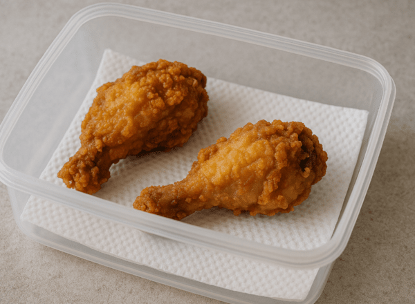 밀폐용기 + 키친타월 조합이 치킨의 바삭함을 유지하는 핵심이다.
