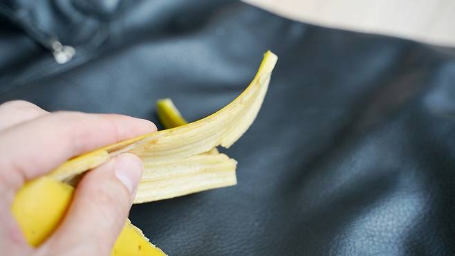 바나나 껍질 안쪽을 보게 되면 하얀색 줄들이 가득한데요. 이 안에는 칼륨, 질소, 황, 카르복실 등의 성분이 있다고 해요. 이 성분들은 가죽에 바를 경우 흠이 생긴 부분을 줄여 주는 동시에 윤을 내주게 된다고 합니다.