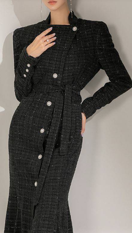 라운드 네크라인으로 부드러운 페이스를 선사해주는 트위드 원피스.
