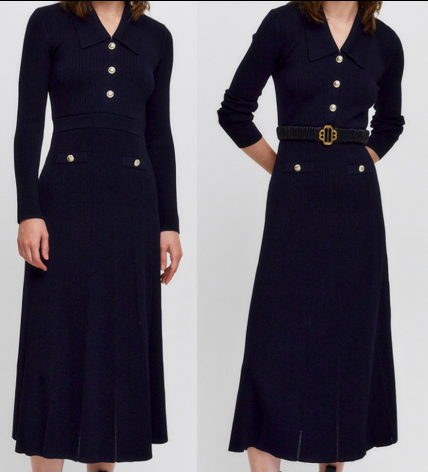 금속 버튼 장식이 포인트인 골지 짜임의 니트 카라 원피스.