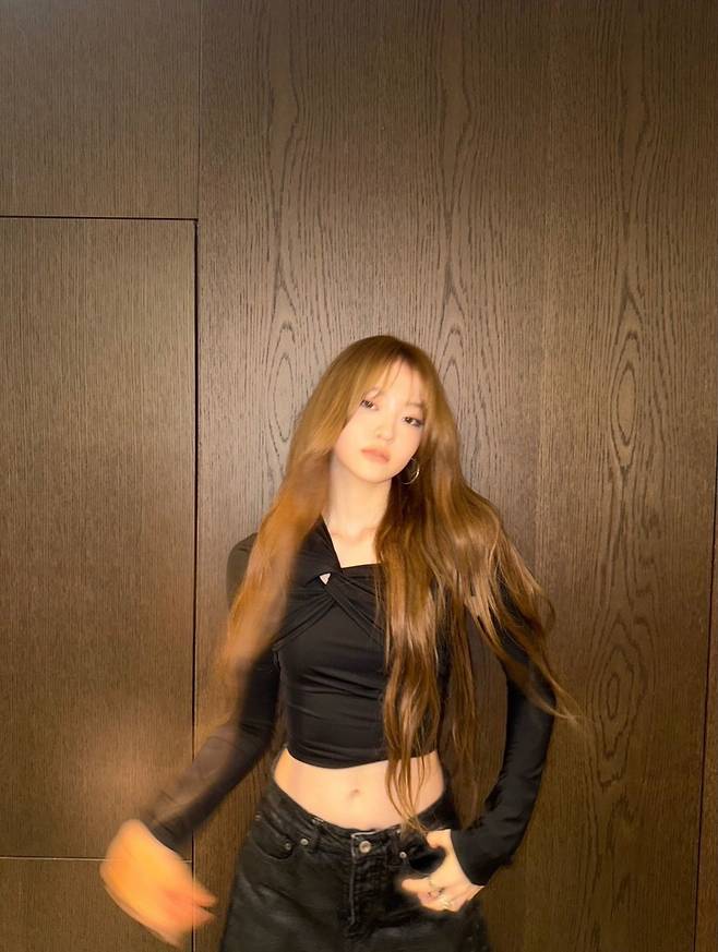 우드 톤 벽 앞에서 포착된 엘라(MEOVV)의 모습이 팬들의 눈길을 사로잡았다. 긴 웨이브 헤어가 자연스럽게 흘러내리며 블랙 크롭 톱과 블랙 데님 팬츠가 만들어내는 대조적인 라인이 단번에 시선을 집중시킨다. 특히 잘록한 허리 라인을 강조하는 실루엣은 무대 위 카리스마와 이어지며, 단순한 일상 컷마저도 화보처럼 연출한다.
