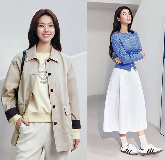 또 다른 화보에서는 고급스러운 디테일의 하이넥 쉘파카를 화이트 케이블 카디건과 스커트를 매치해 모던하면서도 세련된 데이트룩을 완성했다.
