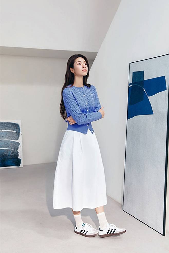 또 하영은 화사한 블루 컬러의 스웨터 카디건과 무릎 아래로 퍼지는 롱기장의 벌룬 스커트로 로맨틱한 감성을 살렸다.
