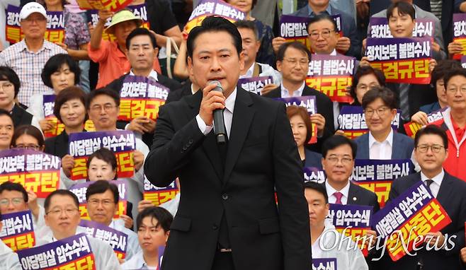 | ▲ 장동혁 국민의힘 대표가 4일 오전 서울 여의도 국회 본관 앞 계단에서 열린 야당말살 정치탄압 특검수사 규탄대회에 참석해 12.3 내란 사건을 주사하는 조은석 특별검사팀의 국민의힘 원내대표실·원내행정실 압수수색 시도를 규탄하고 있다. |