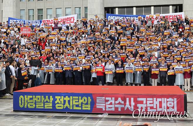 장동혁 국민의힘 당 대표의 외침에 여기저기서 함성이 터져 나왔다. "야당 탄압 정치 보복, 압수수색 중단하라!"라고 쓰인 펼침막이 거칠게 흔들렸다. 4일 오전, 비가 오는 날씨에도 강행된 '야당 말살 정치탄압 특검수사 규탄대회'에 국민의힘 지도부와 국회의원들, 원외당협위원장과 보좌진, 당직자, 당원 등이 국회 본관 앞 계단을 가득 메웠다.