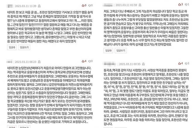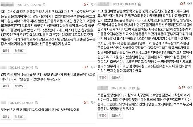 동창들은 "조한선은 일진으로 유명한 게 아니라 축구를 잘하고 잘생겨서 인기가 많았다", "어려서부터 조한선과 친구고 지금까지도 친구다. 그럴 깜냥이 안되는 사람이다. 그냥 찌질한 애다", "조한선과 같은 초등학교, 중학교 같은 해 졸업생이다. 빵셔틀이라고 하는데 역곡중엔 매점이 없었다" 등의 댓글을 달았는데요.