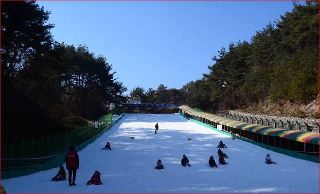 눈썰매장은 부지면적 3,596㎡, 슬로프 길이 120m 규모로 운영되며, 군에서 직접 관리해 안전요원이 상시 4명 배치되어 있습니다. 아이들의 웃음소리와 음악이 어우러져 현장 분위기 또한 매우 활기찹니다.