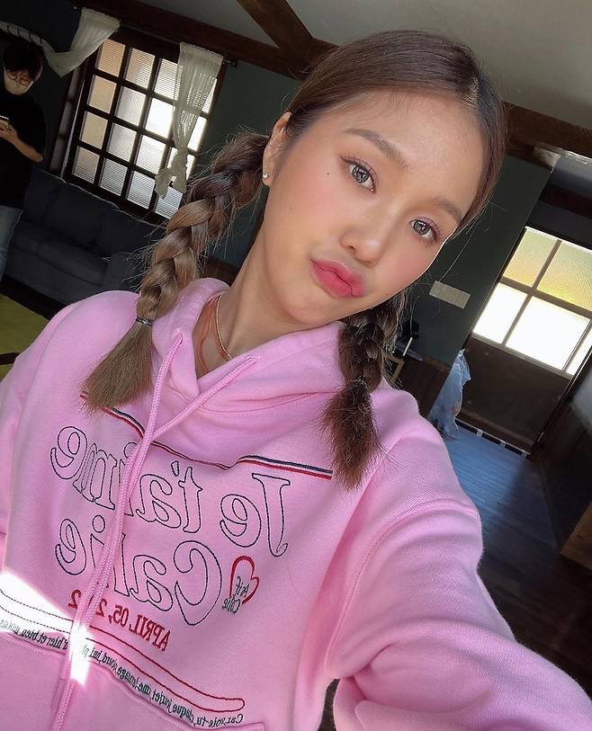 미미는 핑크 후디를 착용했습니다.