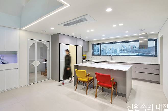 또한 다른 부지보다 2m가량 높이 위치한 점을 활용해 지하 주차장을 조성할 수 있었다. 거실 앞으로는 데크와 마당을 두어 자연과 연계성을 높이고 외부 활동이 용이하도록 계획했다. 계단을 오르내리기가 어려울 수 있어 부부의 안방은 1층에 구성했다. 안방 역시 산을 향해 열려 있어 자연스럽게 외부 풍경을 끌어들인다. 도로 방향에 자리한 주방에는 프라이버시를 지키면서 뷰를 살리기 위해 가로로 긴 창을 배치하였고, 집의 또 다른 포인트가 되었다.