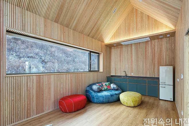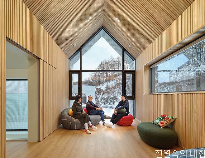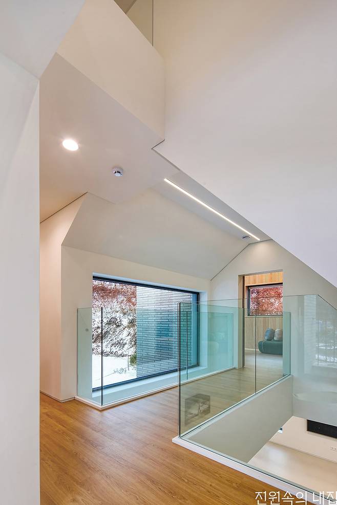 건축주 부부는 많은 사람이 모여 이야기를 나눌 수 있는 장소를 집 안에 만들고 싶었다. 그렇게 탄생한 2층의 가족실 겸 다목적실은 가족이 가장 많은 시간을 보내는 곳이다. 또 지인들을 초대해 편하게 시간을 나누는 홈 카페이기도 하다. 사계절 자연의 경치를 한아름 담을 수 있도록 위치를 잡고 박공 형태를 살려 전면을 모두 창으로 꾸몄다. 옆쪽으로는 가로로 긴 창을 내 파노라마의 풍경을 담는다. 편백향을 좋아하는 아내의 취향을 반영해 벽과 지붕을 편백 루버로 마감했다. 2층에는 자녀 방과 게스트룸이 구성되어 있는데 공적 영역인 가족실과 영역을 분리하기 위해 브릿지로 연결되게 설계했다. 가족실로 가는 통로는 1층 거실의 열린 천장과 연결되어 층마다 연계성을 형성한다. 고정 창으로 들어오는 빛이 1층의 거실까지 닿아 채광 효과도 갖는다.