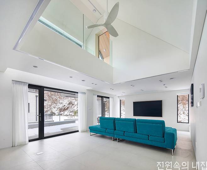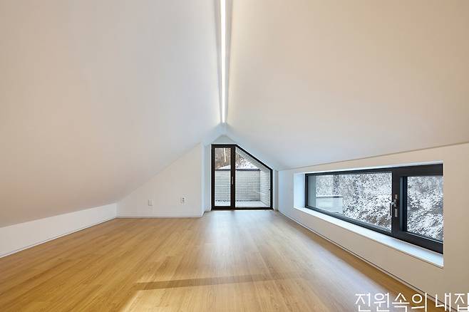 건축주 부부는 많은 사람이 모여 이야기를 나눌 수 있는 장소를 집 안에 만들고 싶었다. 그렇게 탄생한 2층의 가족실 겸 다목적실은 가족이 가장 많은 시간을 보내는 곳이다. 또 지인들을 초대해 편하게 시간을 나누는 홈 카페이기도 하다. 사계절 자연의 경치를 한아름 담을 수 있도록 위치를 잡고 박공 형태를 살려 전면을 모두 창으로 꾸몄다. 옆쪽으로는 가로로 긴 창을 내 파노라마의 풍경을 담는다. 편백향을 좋아하는 아내의 취향을 반영해 벽과 지붕을 편백 루버로 마감했다. 2층에는 자녀 방과 게스트룸이 구성되어 있는데 공적 영역인 가족실과 영역을 분리하기 위해 브릿지로 연결되게 설계했다. 가족실로 가는 통로는 1층 거실의 열린 천장과 연결되어 층마다 연계성을 형성한다. 고정 창으로 들어오는 빛이 1층의 거실까지 닿아 채광 효과도 갖는다.