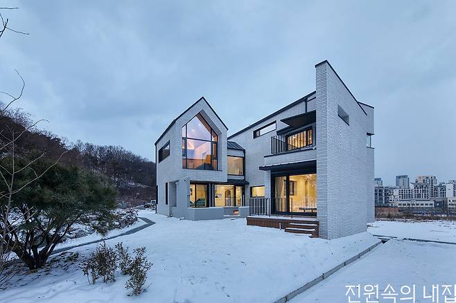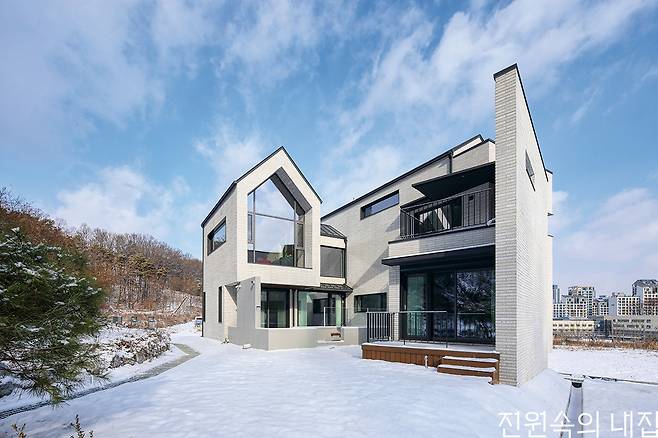 프로젝트를 진행한 호림건축사사무소는 가정의 따뜻한 분위기가 느껴지는 아기자기함과 예술적인 감각을 주택에 녹여냈다. 설계의 첫 번째 주안점은 북쪽과 남쪽에 위치한 아름다운 야산의 풍경을 담으면서, 북측 도로로부터 프라이버시를 확보할 수 있도록 LDK 공간을 배치하는 것이었다. 북측의 인접 대지와 도로를 축으로 실들을 배치하고, 메인 창을 남쪽으로 크고 시원하게 배치해 전체적인 시선이 산으로 향하게 했다. 대지의 모양이 비스듬하게 틀어져 있어 꺾인 ㄷ자형의 특별한 평면이 만들어졌다.
