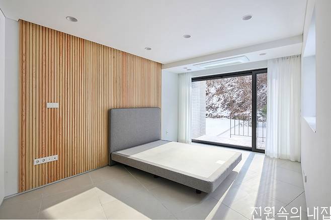 또한 다른 부지보다 2m가량 높이 위치한 점을 활용해 지하 주차장을 조성할 수 있었다. 거실 앞으로는 데크와 마당을 두어 자연과 연계성을 높이고 외부 활동이 용이하도록 계획했다. 계단을 오르내리기가 어려울 수 있어 부부의 안방은 1층에 구성했다. 안방 역시 산을 향해 열려 있어 자연스럽게 외부 풍경을 끌어들인다. 도로 방향에 자리한 주방에는 프라이버시를 지키면서 뷰를 살리기 위해 가로로 긴 창을 배치하였고, 집의 또 다른 포인트가 되었다.