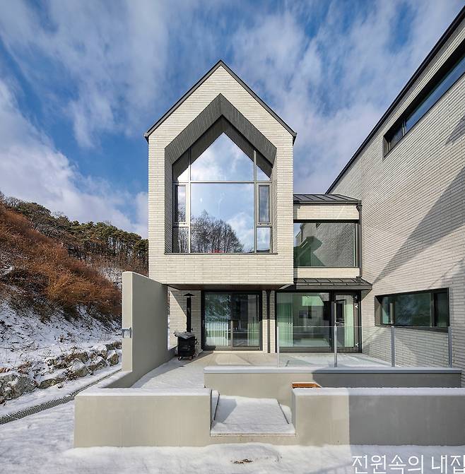 아름다운 자연에 둘러싸인 대지 위, 매일매일 특별한 풍광을 들이는 집을 지었다. 높은 박공 지붕 아래 꾸며진 가족실은 많은 사람들이 모여 이야기를 나누고 자연과 함께 휴식을 취할 수 있는 최고의 장소다.