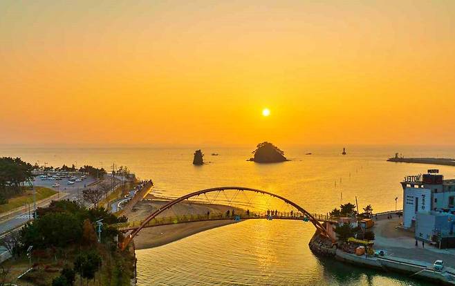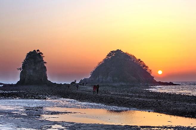 바닷물이 빠지는 썰물 때면 두 바위가 모래톱으로 이어져, 마치 한 몸처럼 보이는 순간도 만날 수 있다.