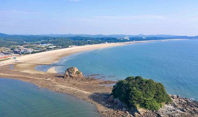 충남 태안군 안면읍에 자리한 꽃지해변은 넓은 백사장과 두 개의 바위만으로도 강한 인상을 남기는 곳이다.