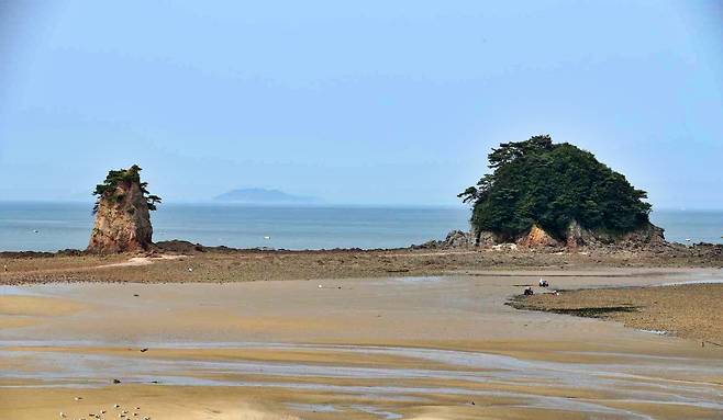 바닷물이 빠지는 썰물 때면 두 바위가 모래톱으로 이어져, 마치 한 몸처럼 보이는 순간도 만날 수 있다.