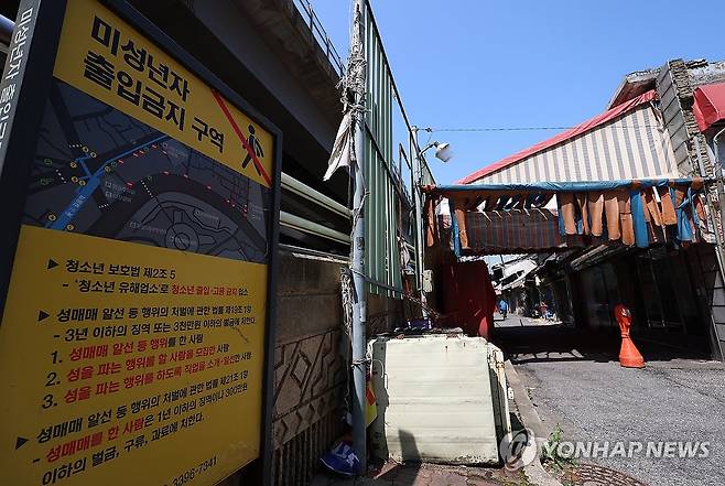 (서울=연합뉴스) 김도훈 기자 = 21일 서울 성북구 하월곡동에 위치한 성매매집결지인 미아리 텍사스촌 골목 입구에 미성년자 출입금지 표지가 붙어 있다.