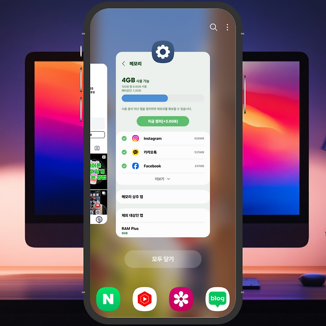 백그라운드에서 실행되는 앱을 종료하면 메모리(RAM) 점유를 줄이고, 스마트폰 속도가 향상됩니다.